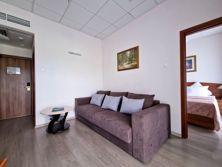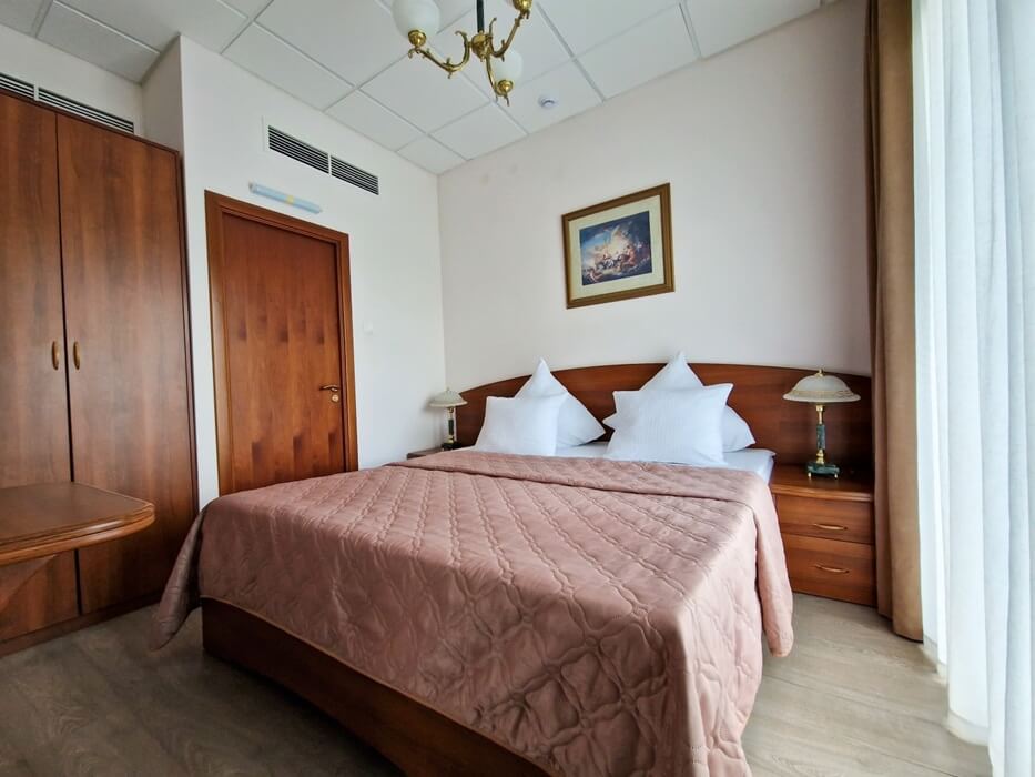 Оснащение 2-спальная кровать, санузел с ванной, балкон, кондиционер, мягкая мебель, шкаф/гардероб, телевизор, телефон, холодильник, чайник, столовые приборы, фен, халат, набор полотенец, туалетные принадлежности