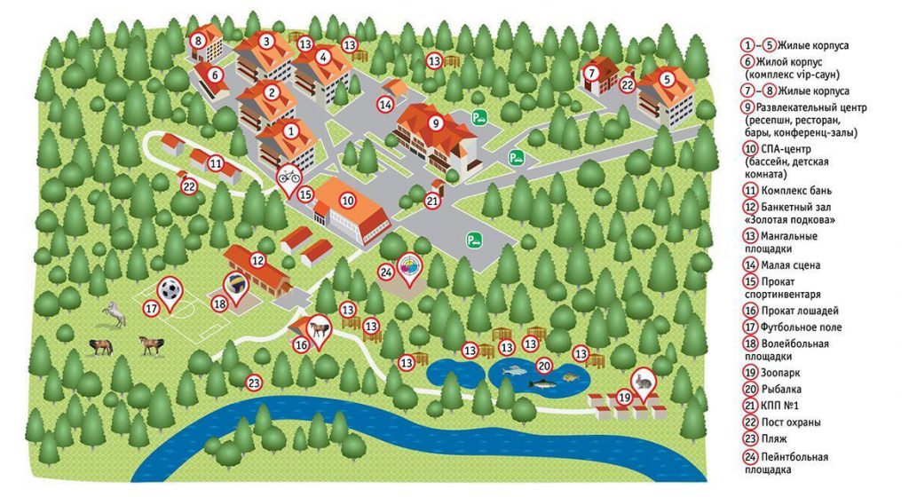 В распоряжении гостей находится большой номерной фонд — 153 комфортных номера различных категорий, расположенных в 7 уютных корпусах, оформленных в стиле «кантри». На всей территории отеля доступна сеть Wi-Fi, а сам отель открыт для посещений круглосуточно.